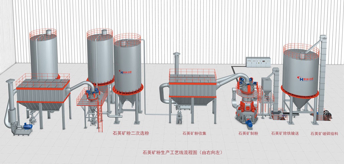 石英礦粉生產工藝線流程圖展示從石英礦礦石破碎、石英礦礦石提升存料、石英礦礦石輸送定量給供料進入磨粉機、石英礦礦石磨粉、石英礦礦石磨粉選粉、石英礦礦石粉體收集...